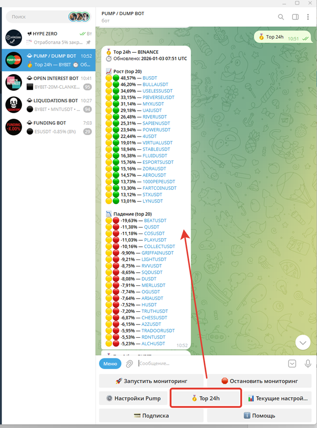 Присылает по 20 топ монет по росту и падению (для каждой биржи, если обе включены в настройках).
