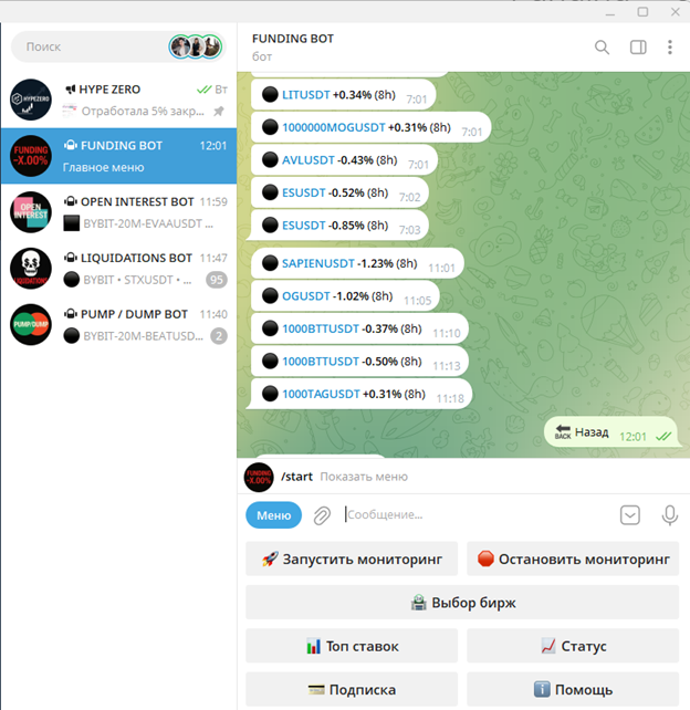 Для уведомлений по Bybit дополнительно приходит время обновления фандинга: (2h) / (4h) / (8h).