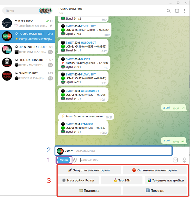 - 🚀 Запустить мониторинг — включает отправку сообщений от бота